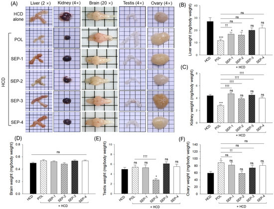 Organ morphology and organ weight of hyperlipidemic zebrafish post 14 weeks consumption of policosanol and different sugarcane extract powder. (A) Representative organ (liver, kidney, brain, testis, and ovary) morphology obtained from different groups. Average weight of (B) liver, (C) kidney, (D) brain, (E) testis, and (F) ovary. The * and *** represent the statistical difference at p < 0.05 and p < 0.001 with respect to the HCD group, while †† (p < 0.01) and ††† (p < 0.01) highlight the statistical significance vs. the POL group. The “ns” represents the non-significant difference. The acronyms HCD: High cholesterol diet, POL: policosanol, and SEP: sugarcane extract powder.