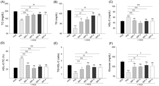 An elevated total cholesterol (TC, 198.5 ± 1.5 mg/dL) level was noticed in the HCD-supplemented group (Figure 3A), which is 1.2-fold higher than the basal level (168.3 ± 12.6 mg/dL) detected at week 0 (Supplementary Table S1). The co-supplementation of POL (138.1 ± 1.3 mg/dL), SEP-1 (167.4 ± 2.5 mg/dL), and SEP-2 (175.1 ± 1.4 mg/dL) effectively reduced the HCD elevated TC level (Figure 3A). However, when compared with SEP-1 and SEP-2, POL displayed significantly lower TC levels of 18% and 12%, reflecting POL’s higher efficacy over SEP-1 and SEP-2. In contrast, no significant effect of SEP-3 and SEP-4 supplementation was noticed on the HCD-induced TC levels.