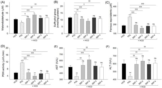 HCD elevated plasma AST and ALT levels were significantly reduced by 29.9% and 26.7% following the co-supplementation of POL. In contrast, no significant (p > 0.05) effect of any SEP products was noticed towards the reduction of HCD elevated AST and ALT levels (Figure 4E,F). Furthermore, the SEP-2 supplementation demonstrated a significant 1.2-fold (p < 0.05) additive effect toward the HCD elevated AST level.