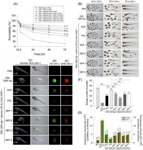Further embryo morphological evaluation suggests stunted growth, tail fin curvature (indicated by red arrow), yolk sac edema (indicated by black arrow), pericardial edema (indicated by blue arrow), and reduced somite counts in the majority of embryos from the CML-injected group, depicting a severe teratogenic effect of CML (Figure 5B,C,F). The CML posed severe developmental deformities, substantially countered by the co-injection of plasma from different groups. Among the various groups, the least restrained against CML posed deformities were observed in the embryos injected with plasma from the HCD and SEP-2 groups, where many embryos appeared with tail fin curvature, yolk sac, and pericardial edema with reduced somite counts (15–20). In contrast, embryos injected with plasma from the POL group effectively rescued embryos from the CML-induced developmental deformities as reflected by the heightened somite counts (31) that are analogous to the somite counts observed in the PBS injected group (33).