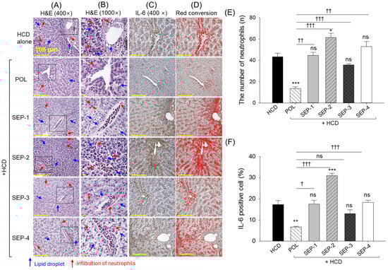 The images of H&E staining, as depicted in Figure 6A,B,E, revealed a heightened neutrophil count in the HCD group, which was significantly reduced by 3.2-fold following HCD co-supplemented with POL. Contrary to the POL, the co-supplementation of all SEPs has no significant effect on reducing the HCD elevated neutrophil counts. Even more, SEP-2 displayed a significantly 1.4 times higher neutrophil count compared to the HCD group.