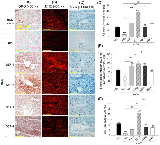 As depicted in Figure 7A,B,D,E, the HCD-consumed group showed a substantial ORO-stained area and DHE fluorescent intensity, highlighting the fatty liver and ROS generation. The supplementation of POL effectively prevents the HCD-induced fatty liver and ROS generation, as indicated by a significant 4-fold and 1.3-fold reduction in ORO-stained area and DHE fluorescent intensity, respectively. Juxtapose, the SEP-1, SEP-2, and SEP-4 supplementation showed a significantly 1.4-fold, 2.6-fold, and 1.4-fold higher ORO-stained area, respectively, than the HCD group, documenting the potential adverse effect of SEP-1, SEP-2, and SEP-4 towards fatty liver. A non-significant effect of SEP-3 was noticed against HCD-induced fatty liver. Similar to the ORO staining, a significantly 1.4-fold (p < 0.05) higher DHE fluorescent intensity was logged in the SEP-2 supplemented group than the HCD group. However, a non-significant effect of SEP-1, along with SEP-3 and SEP-4 was observed on HCD-induced ROS production.