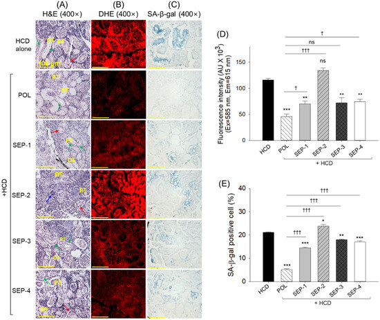 A high prevalence of senescent positive cells was quantified in the HCD supplemented group, which was significantly reduced by 4.1-fold, 1.4-fold, 1.3-fold, and 1.4-fold following the co-supplementation of POL, SEP-1, SEP-3, and SEP-4 (Figure 8C,E). However, compared with SEP-1, SEP-3, and SEP-4 supplemented groups, a significantly ~3-fold reduced ROS level was observed in the POL supplemented group, underscoring the higher efficacy of POL over SEP products.