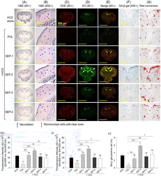 Similarly, the least cellular senescence was observed in the POL-supplemented group, which was significantly 3-fold lower than that in the HCD-consumed group (Figure 9F,G,J). Compared to the HCD group, all SEP-consumed groups displayed a non-significant effect in preventing HCD-induced senescence. Notably, SEP-2 displayed a significantly higher senescence than the HCD consumed group, indicating its provocative effect on HCD-induced senescence in the brain.