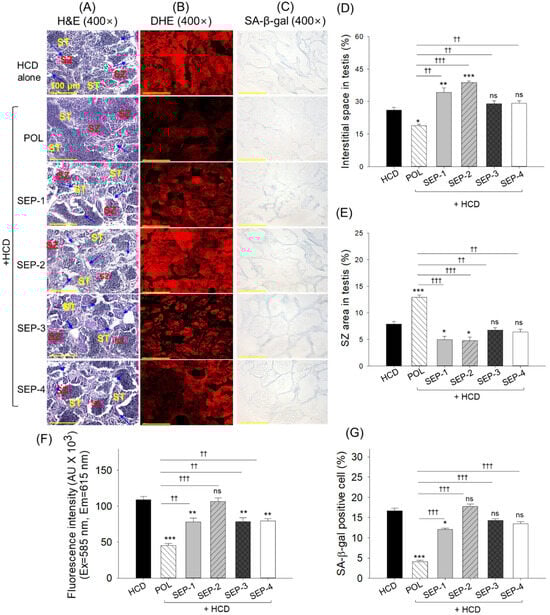 Histological analysis of testis from the hyperlipidemic zebrafish post 14 weeks of dietary intake of policosanol and different sugarcane extract powder. (A) Hematoxylin and eosin (H&E) staining, (ST: spermatocytes, SZ: spermatozoa), blue arrow highlights disruption of the basal lamina membrane. (B) Dihydroethidium (DHE) fluorescent staining. (C) Senescent-associated β-galactosidase (SA-β-gal) staining [scale bar, 100 μm]. (D,E) Quantification of the interstitial space between the seminiferous tubules and spermatozoa counts, respectively. (F,G) Quantification of DHE fluorescent intensity and SA-β-gal positive cells, respectively. The *, **, and *** represent the statistical difference at p < 0.05, p < 0.01, and p < 0.001 with respect to the HCD group, while †† (p < 0.001) and ††† (p < 0.001) highlight the statistical significance vs. the POL group. The ns represents the non-significant difference—the acronyms HCD: high-cholesterol diet, POL: policosanol, while SEP: sugarcane extract powder.