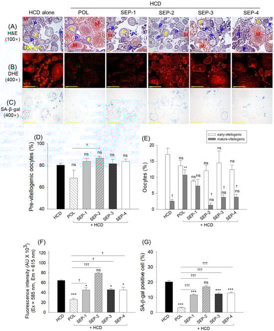 Histological analysis of the ovary from the hyperlipidemic zebrafish post 14 weeks of dietary intake of policosanol and different sugarcane extract powder. (A) Hematoxylin and eosin (H&E) staining (abbreviation represents P: pre-vitellogenic oocytes, E: early-vitellogenic oocytes, and M: mature-vitellogenic oocytes). (B) Dihydroethidium (DHE) fluorescent staining. (C) Senescent-associated β-galactosidase (SA-β-gal) staining [scale bar, 100 μm]. Quantification of (D) pre-vitellogenic oocytes, (E) early and mature-vitellogenic oocytes, (F) DHE fluorescent intensity, and (G) SA-β-gal positive cells. The *, **, and *** represent the statistical difference at p < 0.05, p < 0.01, and p < 0.001 with respect to the HCD group, while † (p < 0.05), and ††† (p < 0.001) highlight the statistical significance vs. the POL group. The “ns” represents the non-significant difference. The acronyms HCD: high-cholesterol diet, POL: policosanol, and SEP: sugarcane extract powder.