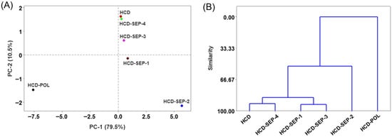 Furthermore, the HCA supports the PCA findings, placing the HCD and HCD-SEP-4 groups in the same cluster (based on the highest similarity ~93%), and the HCD-SEP-1 and HCD-SEP-3 groups in another cluster (~92% similarity) (Figure 12B). These clusters were further merged and displayed at ~52% similarity with the HCD-SEP-2 group. In contrast, HCD-POL showed the least similarity with these groups. The multivariate analysis clearly depicts a distinct effect of HCD-POL on the SEPs towards the adverse events associated with HCD.