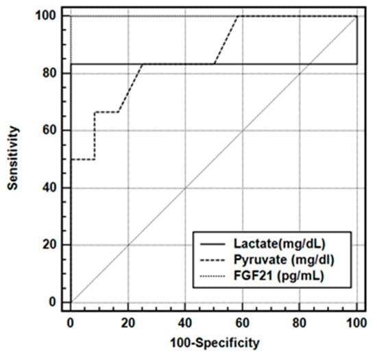 All patients were in a stable phase during the phlebotomy. After fasting for approximately 4 h, the blood sample taken into a gel tube (Becton, Dickinson and Company (BD), Franklin Lakes, NJ, USA) was left for 45 min and centrifuged at 4000 rpm for 10 min. The supernatant was stored at −80 °C until the time of analysis. The analysis was performed by enzyme-linked immunosorbent assay (ELISA) after all samples were collected. Serum FGF21 measurements (Catalogue No. DF2100, Quantikine ELISA Kit, R&D Systems, Inc., Minneapolis, MN, USA) were performed using the sandwich enzyme immunoassay technique, and results were evaluated in pg/mL. The assay is based on the method of quantitative sandwich enzyme immunoassay, and the intra-assay and inter-assay coefficients of variation (CV%) were 2.9–3.9% and 5.2–10.9%, respectively. The traditional biomarkers lactate (LA) and pyruvate (PA) were evaluated in plasma together with FGF21. Plasma lactate levels were analyzed using a colorimetric method in the ADVIA Chemistry LAC original reagent in the ADVIA Chemistry XPT autoanalyzer (Siemens Healthcare Diagnostics, Forchheim, Germany). Plasma pyruvate levels were measured spectrophotometrically with a commercial kit according to the manufacturer’s instructions (Ben S.r.l. Biochemical Enterprise, Milan, Italy). Pyruvate and lactate results were expressed as mg/dl. Reference ranges for lactate and pyruvate are 4.5–20 mg/dL and 0.3–0.9 mg/dL, respectively.