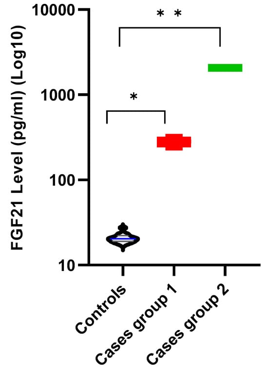 After calculating the means and standard deviations of the case and control groups, two patients were named Case Group 2 (SARS2 and WARS2) because their FGF21 levels were much higher than those of the others. The other four patients were designated Case Group 1. Case Group 2 had higher FGF21 levels than Case Group 1. A violin plot was used to visualize the difference in FGF21 levels between groups, and since the difference in FGF21 levels between individuals was very high, a logarithmic transformation was applied (Figure 2).