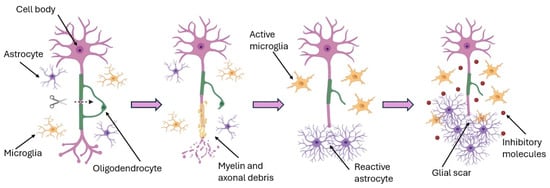 Injuries to the central nervous system (CNS), such as spinal cord injury, traumatic brain injury, and stroke, are typically devastating and result in lifelong neurological deficits. The adult CNS has very limited ability to regenerate damaged neurons or axons, due in part to the inhibitory environment that develops after injury (for example, glial scar formation and myelin-associated inhibitors) and the intrinsic lack of regenerative capacity in mature CNS neurons []. Figure 1 illustrates the complex biological response of the CNS to injury, including glial scarring and neuroinhibitory signaling, which collectively impair regeneration.