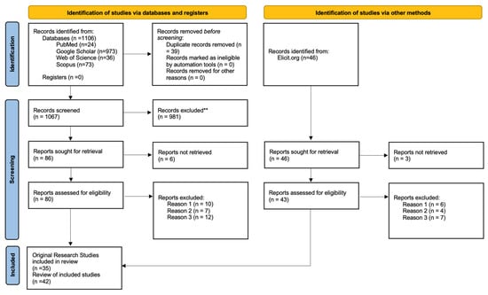 Systematic selection of studies following the PRISMA 2020 flow diagram for new systematic reviews which included searches of databases, registers, and other sources. The systematic search was conducted using five electronic databases: PubMed, Google Scholar, Web of Science, Scopus, and Elicit.org. A total of 1152 records were identified. ** Exclusion criteria included the following (**): Reason 1: Non-MSC cell sources (e.g., embryonic stem cells, iPSCs). Reason 2: Non-electrospun scaffolds (e.g., porous foams, freeze-dried matrices, and 3D-printed). Reason 3: Studies not involving the nervous system or neural outcomes.