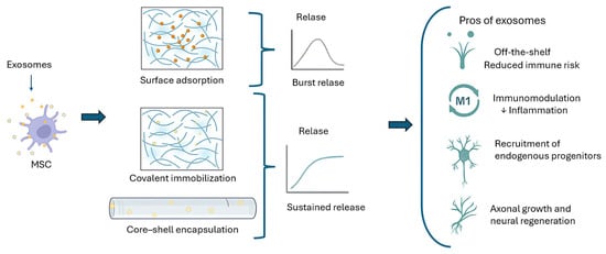 MSC-derived exosomes can be integrated into electrospun scaffolds by surface adsorption, covalent immobilization, or core–shell encapsulation, leading to distinct release profiles. Once released, exosomes provide immunomodulatory, neuroprotective, and regenerative effects, offering a promising acellular alternative to live MSC transplantation. ↓ indicate the exosomes.