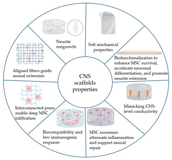 The mechanical characteristics of a scaffold are another critical design factor, particularly stiffness (elastic modulus). Neural tissue like the brain and spinal cord is extremely soft (storage modulus in the order of 0.1–1 kPa). If a scaffold is too stiff relative to the host tissue, it can cause mechanical mismatch, glial scarring, and even direct cells towards non-neural fates (e.g., osteogenesis). For MSC-based neural applications, studies indicate that substrates with a modulus in the soft range (<1–10 kPa) support neuronal differentiation, whereas very rigid substrates (>20–30 kPa) push MSCs towards osteogenic or glial lineages []. Electrospun fibers of commonly used synthetic polymers are often relatively stiff (PCL mats can be several MPa in modulus). To soften the microenvironment, researchers have developed hybrid scaffolds that combine electrospun fibers with hydrogel matrices. In these composites, the fibrous scaffold provides tensile strength and guidance, while the interpenetrating hydrogel (e.g., collagen, alginate, and self-assembling peptide hydrogel) provides tissue-like softness and high water content []. One example is an electrospun PCL/chitosan mesh embedded in an alginate hydrogel. This hybrid scaffold retained the aligned fibrous structure (for guidance) but had a bulk stiffness an order of magnitude lower than the pure fiber mat. In vitro, MSCs on the soft hybrid showed greater neurite extension and expressed higher βIII-tubulin and MAP2 than on the stiff fiber mat alone []. The alginate hydrogel not only softened the matrix but also provided bioactive cues and improved nutrient diffusion, resulting in healthier, more neuronal-like MSCs. Similarly, incorporating a physically crosslinked gelatin or collagen hydrogel with electrospun fibers can mitigate the acidic byproducts of polymer degradation (e.g., PLGA releases lactic acid) and reduce inflammatory responses. Hydrogels can also be loaded with anti-inflammatory drugs or factors like IL-10 to locally counteract any immune reaction to the scaffold []. Such smart designs improve implantation feasibility and reduce additional tissue damage during surgery. In conclusion, the mechanical tuning of electrospun scaffolds, whether by choosing softer polymers, blending with hydrogels, or using smart materials, is essential to create a permissive environment for neural regeneration. The most promising platforms tend to be composites that achieve an optimal balance: they possess the aligned, fibrous structure needed for axon guidance and MSC morphology cues, yet they are soft and hydrated enough to integrate with host tissue and avoid triggering foreign body responses. For instance, a recent composite scaffold of aligned fibers within a viscoelastic hydrogel was implanted in a spinal injury model and showed minimal glial scar formation alongside robust axonal ingrowth []. By integrating mechanical biocompatibility with the earlier mentioned biochemical and topographical features, modern electrospun scaffolds can be multifunctional platforms that address the multifaceted challenges of CNS regeneration. A summary of the ideal properties required for CNS scaffolds is presented in Figure 4. Soft mechanical properties mimic native CNS tissue elasticity, while biofunctionalization enhances MSC survival, accelerates neuronal differentiation, and drives neurite extension. Electrical conductivity tuned to the CNS level delivers optimal stimulation, and MSC-derived exosomes mediate local immunomodulation to attenuate inflammation and support repair. Inherent biocompatibility with low immunogenicity ensures seamless integration, and interconnected porosity together with aligned fiber architecture fosters deep cell infiltration, three-dimensional network formation, and guided axonal outgrowth.