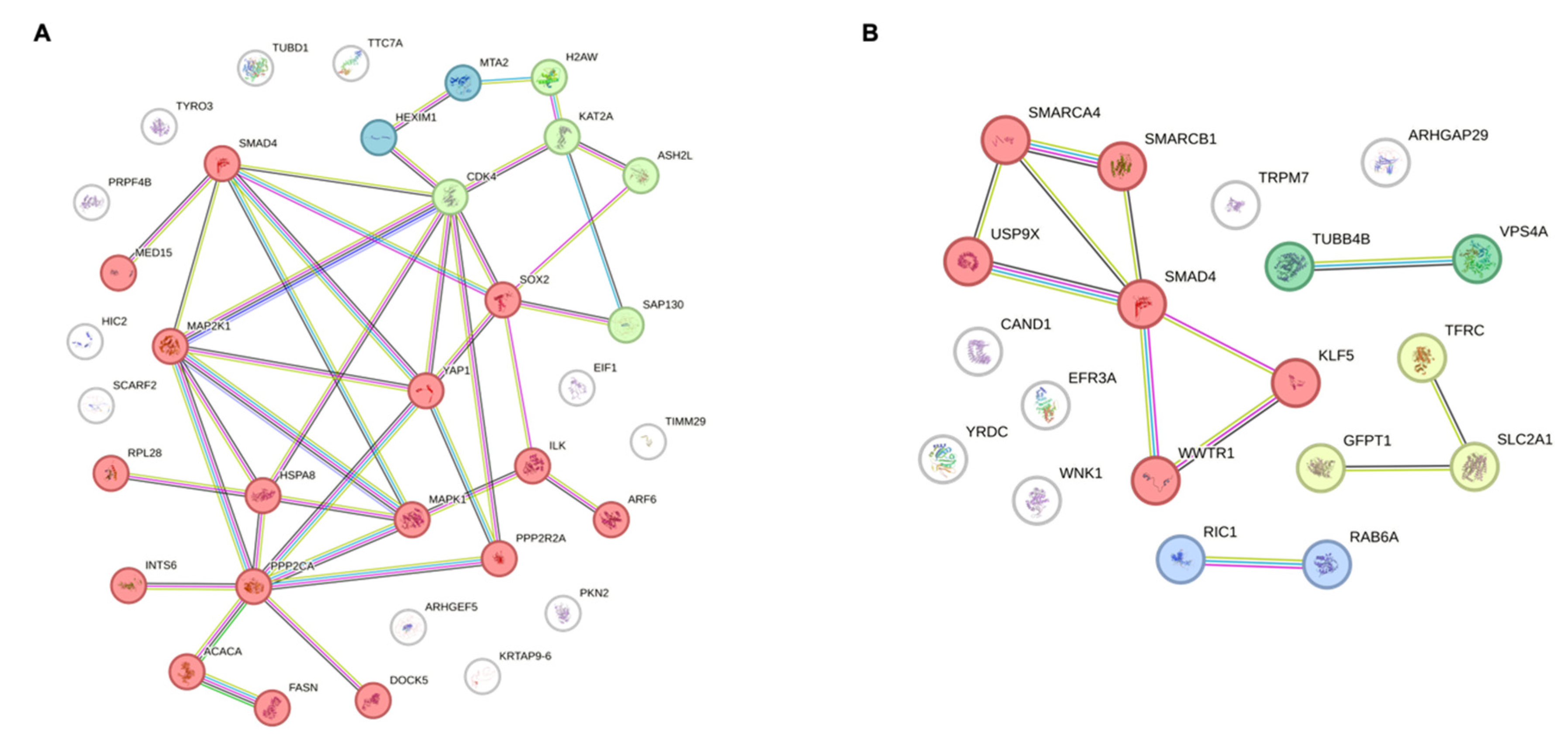 - Szklarczyk, D.; Kirsch, R.; Koutrouli, M.; Nastou, K.; Mehryary, F.; Hachilif, R.; Gable, A.L.; Fang, T.; Doncheva, N.T.; Pyysalo, S.; et al. The STRING database in 2023: Protein-protein association networks and functional enrichment analyses for any sequenced genome of interest. Nucleic Acids Res. 2023, 51, D638–D646. [Google Scholar] [CrossRef]