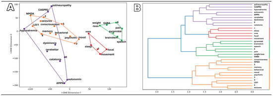 To explore relationships between symptoms and clinical outcomes in Ab-positive AE, Jaccard and Dice dissimilarity coefficients were calculated to construct dissimilarity matrices. These were visualized using t-distributed stochastic neighbor embedding (t-SNE) for Jaccard distances, hierarchical clustering, and heat maps for both Jaccard and Dice distances (Figure 1). Although t-SNE is primarily used for dimensionality reduction, here it represented similarities between features (e.g., symptoms, antibodies), not individual cases. Plots were color-coded according to clusters identified via hierarchical clustering of the same dissimilarity matrices. Due to the limited sample size, reliable similarity results were obtained only for the anti-NMDAR, anti-LGI1, and anti-CASPR2 subgroups, which had the largest number of cases.