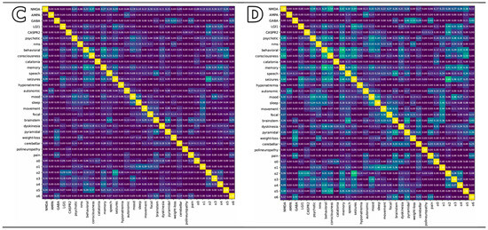 Visualization of relationships between clinical symptoms, Abs, and outcomes: (A) t-SNE plot (Jaccard dissimilarity), (B) hierarchical plot, (C) heat map (Jaccard), and (D) heat map (Dice). NMDA, LGI1, CASPR2, AMPA, and GABA indicate the Abs identified; symptom names are given as specific disorders (e.g., polyneuropathy, dyskinesia, nms–neuroleptic malignant syndrome) or as categories (e.g., “memory” for memory disorders). Outcomes at 12 months after AE diagnosis are coded as: 0—no symptoms; 1—relapse; 2—epilepsy; 3—psychiatric disorder; 4—cognitive decline; 5—death; 6—other focal symptoms. Colors indicate clusters from hierarchical clustering of the same dissimilarity matrices.