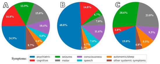 Symptoms in (A) patients with Ab-positive AE, (B) patients with Ab-negative AE, and (C) Ab-positive individuals without AE. Colors represent: psychiatric (behavioral, psychotic, anxiety, depression, bipolar disorders, neuroleptic malignant syndrome, catatonia), cognitive (memory disorders, dementia), seizures (seizures, status epilepticus, myoclonus), motor (parkinsonism, dyskinesia, PSP-like, lower limb paresis, pyramidal syndrome, focal symptoms, cerebellar syndrome, oculomotor symptoms), consciousness (altered consciousness), speech (dysarthria, aphonia), autonomic/sleep, and other systemic symptoms (pain, paresthesia, polyneuropathy, hyponatremia, weight loss, dysphagia, urinary symptoms).