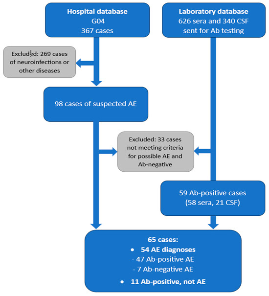 The initial search identified 367 patients with a G04 diagnosis, the majority with encephalitis of infectious origin (e.g., viral, bacterial, or other) and paraneoplastic encephalitis with Abs to intracell antigens (amphiphisin, CV2, PNMA2, Ri, Yo, recoverin, SOX1, zic4, GAD65, Tr, titin). Of these, 98 were suspected of AE. Each case was independently reviewed by three researchers (K.K., I.K.-J., A.P.) for clinical and paraclinical data (e.g., serum/CSF analysis, brain MRI, EEG), with regard to serological Ab findings and fulfillment of the possible AE criteria as proposed by Graus et al. [12]: (1) subacute onset (<3 months) of memory deficits, altered mental status (decreased/altered consciousness, lethargy, or personality change), or psychiatric symptoms; (2) at least one supportive feature, such as new focal CNS findings, unexplained seizures, CSF pleocytosis > 5 cells/μL, or MRI abnormalities; (3) exclusion of alternative causes.