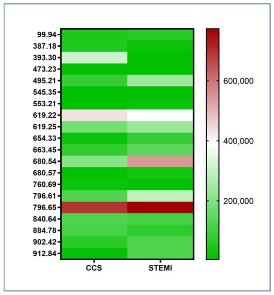 No significant differences in monocyte lipidomes were observed between STEMI and CCS patients (STEMI n = 10; CCS n = 10; and p = n.s.) (Figure 2). Table S1 reports the LM IDs, names, systematic names, and formulas of the analyzed lipids (Table S1).