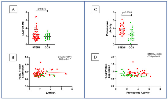 LAMP2A was not different in the two groups [STEMI vs. CCS 1.960 (1.490–2.880) vs. 2.025 (1.410–2.423); p = n.s.] and was not correlated with PLIN2 protein expression (p = n.s.) (Figure 3A,B). Proteasome activity was higher in STEMI as compared to CCS patients (STEMI vs. CCS 3.788 ± 1.078 vs. 2.372 ± 1.327; p < 0.001), and a significant inverse correlation was evident between PLIN2 levels and proteasome activity in the CCS group (p = 0.018), while it was not significant in the STEMI group (Figure 3C,D).