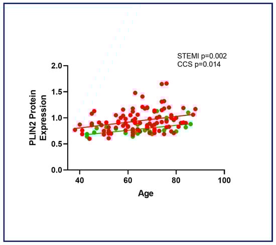 PLIN2 protein expression was correlated with age in CAD patients. In a univariate analysis of variance, the difference in the two age-related PLIN2 correlations in STEMI and CCS patients was significant. Abbreviations: perilipin-2 (PLIN2); ST-elevation myocardial infarction (STEMI); and chronic coronary syndrome (CCS).