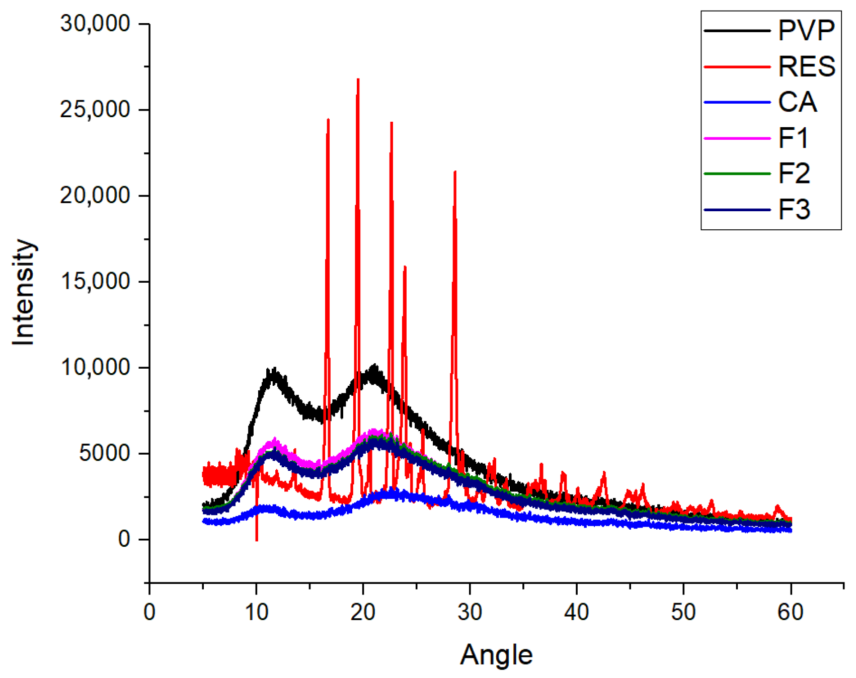 Figure 6. XRD patterns of the three raw components (RES, PVP, and CA) and the different kinds of electrospun nanofibers (F1, F2, and F3).