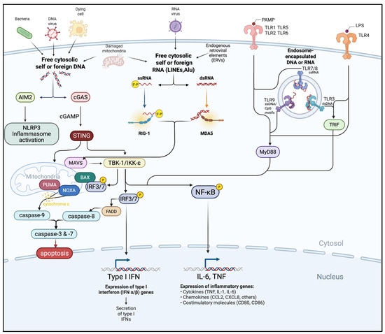 Crosstalk of cytosolic and endosomal innate immune sensing pathways. Foreign or aberrantly located self-DNA and RNA derived from pathogens, dying cells, damaged mitochondria, or endogenous retroviral elements (ERVs) are detected by cytosolic (AIM2, cGAS, RIG-I, MDA5, TLR1, TLR2, TLR5/6, TLR4) or endosomal sensors (TLR3, TLR7/8, TLR9). These pathways converge on adaptor proteins (STING, MAVS, MyD88, TRIF) and downstream kinases (TBK1/IKKε) to activate transcription factors (IRF3/7, NF-κB), pro-apoptotic mediators, and caspases. The resulting responses include IFN-I and pro-inflammatory cytokine production, inflammasome activation, and induction of apoptosis. Figure created using Biorender.com.