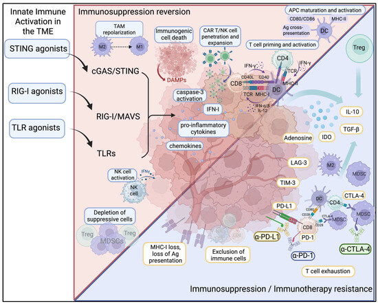 Innate immune activation reverses immunosuppression and immunotherapy resistance in the tumor microenvironment. Solid tumors employ immunosuppressive mechanisms such as loss of MHC-I, downregulation of the antigen-presentation machinery, infiltration of MDSCs and Tregs, and upregulation of inhibitory checkpoints (PD-1/PD-L1, CTLA-4, LAG-3) and immunosuppressive cytokines (IL-10, TGF-β), which drive resistance toward immune checkpoint blockade and adaptive CAR T/NK cell therapies. Agonists of STING, RIG-I, and TLR pathways activate innate immune signaling within the TME, leading to the production of IFN-I, pro-inflammatory cytokines, and chemokines, as well as inducing immunogenic cell death. These mechanisms collectively reprogram the cold TME into a hot tumor milieu, promoting maturation and activation of DCs, priming of antigen-specific T cells, NK cell activation, TAM repolarization, and depletion of suppressive cells, ultimately enhancing anti-tumor immunity and reversing therapy resistance. Figures created using BioRender.com.