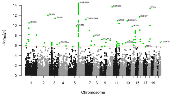The Manhattan plot for genes identified by MAGMA. The x-axis represents the gene position on the chromosome; the y-axis represents the negative decimal logarithm of the p-value calculated by MAGMA. Green points refer to genes with p-values less than 0.05/19,081 = 2.62 × 10−6.