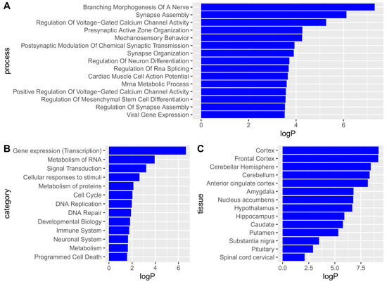 Results of gene-set enrichment analysis for genes identified by MAGMA: (A) top 15 Gene Ontology biological processes; (B) high-level Reactome pathways; (C) significant tissues from the GTEx database. logP is a negative decimal logarithm of the enrichment p-value.