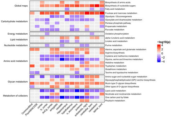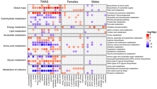 The revealed KEGG metabolic pathways based on TWAS-derived genes. The color of cells depends on the negative decimal logarithm of enrichment p-values. Red and blue colors refer to pathways enriched with up- and down-regulated genes, respectively.