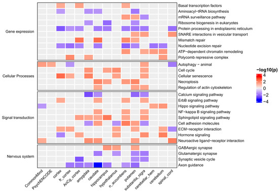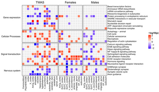 KEGG signaling pathways and cellular processes revealed based on TWAS-derived genes. The color of cells depends on the negative decimal logarithm of enrichment p-values. The red and blue colors refer to pathways enriched with up- and down-regulated genes, respectively.