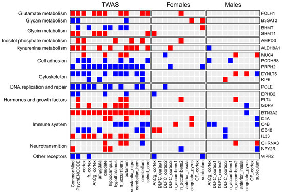 We compared the list of TWAS-derived genes with the lists of DEGs. It was found that only 99, 40, 19, 9, 5, 4, and 2 out of 684 TWAS-derived genes were differentially expressed in at least 1, 2, 3, 4, 5, 6, and 7 of the 20 transcription datasets (see Table S10). Figure 5 demonstrates 23 TWAS-derived genes involved in MDD-related pathways (see Table 1, Table 2 and Table 3) that were differentially expressed in one or several brain regions from either males or females. The transcription of some of them, e.g., complements C4A and C4B and the CD40 receptor, was changed in different directions in males and females. The direction of SNP-induced gene expression changes predicted by TWAS was similar to gene transcription changes observed in either males or females depending on the gene. This can be explained by the fact that TWAS was performed based on eQTL data, which was obtained using transcription profiles from the joint male and female data.