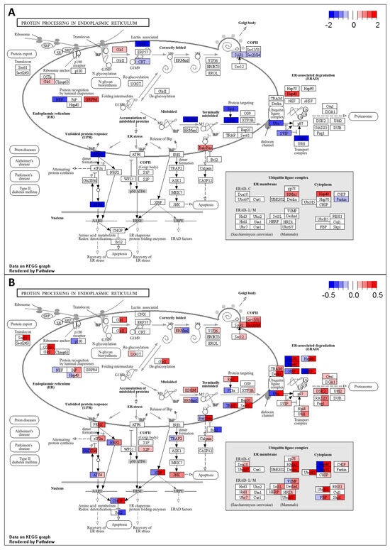 Comparison of the transcription changes in genes in the dorsolateral prefrontal cortex predicted by TWAS (A) and obtained by transcription analysis (B) that are involved in protein processing in the endoplasmic reticulum. The color of pathway nodes depends on either TWAS z-scores (A) or logFC values (B). The colors of the left and right parts of the pathway nodes depend on logFC values obtained for males and females, respectively (B). Generally, red and blue colors refer to up- and down-regulated genes, respectively. Part (A) of the figure was created using TWAS z-scores obtained using GTEx cortex data, while part (B) was created using logFC values obtained by analysis of dorsolateral prefrontal cortex data from the GSE80655 dataset.