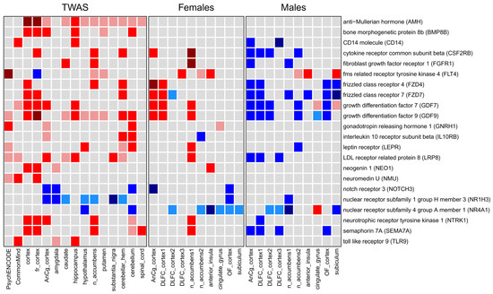 We identified several signaling pathways as related to MDD and more thoroughly estimated the role of receptors and their ligands because they are extremely important for communication between neurons and other cells. Besides receptors for the neurotransmitters described above, we identified two large groups of receptors and ligands: hormones and growth factors, and immune proteins. The role of central and peripheral inflammation in the pathogenesis of MDD is well described in the literature [70]. What is less trivial are the links with MDD for anti-Mullerian hormone (AMH), growth differentiation factor 9 (GDF9), and nuclear receptor subfamily 1 group H member 3 (liver X receptor alpha) (NR1H3). Anti-Mullerian hormone and growth differentiation factor 9 are involved in the regulation of ovarian folliculogenesis. The transcription of genes encoding both hormones was predicted by TWAS to be increased. However, to date, no associations were found for anti-Mullerian hormone level and depression [108,109], whereas growth differentiation factor 9 was not investigated in relation to MDD. Liver X receptor alpha is expressed in the brain and acts as a central cholesterol regulator, is involved in myelination and remyelination processes, maintains the blood–brain barrier, provides neuroprotective effects, and lowers neuroinflammation [110,111,112].