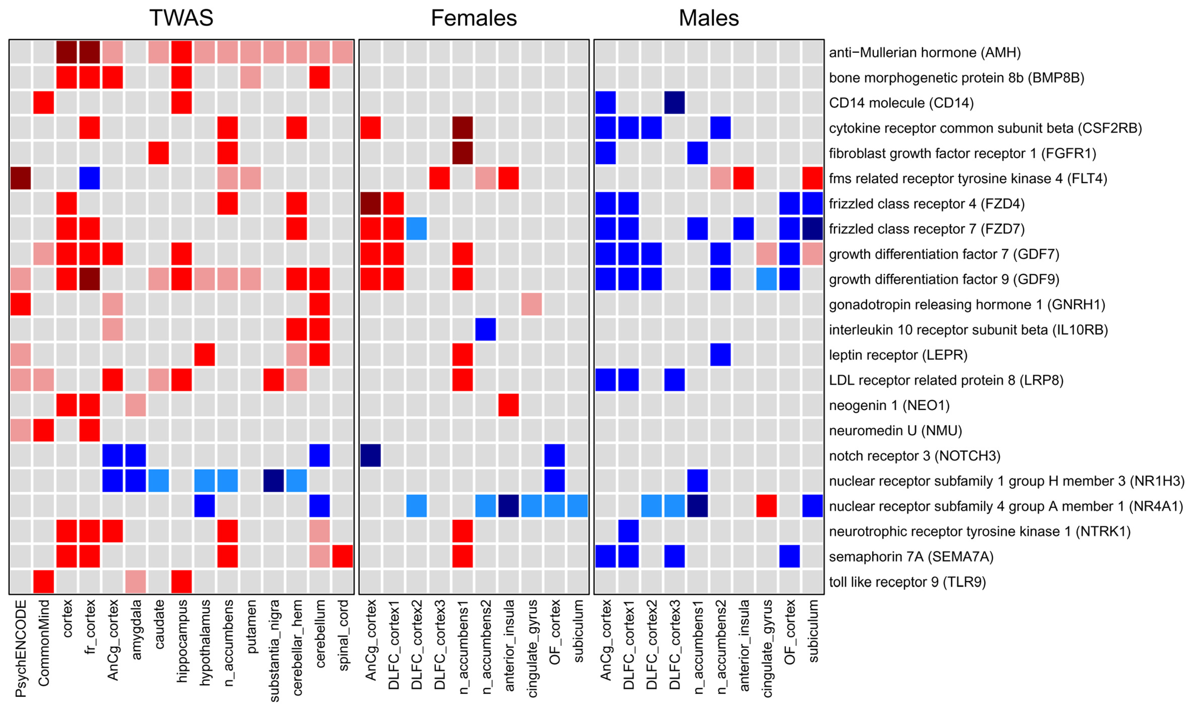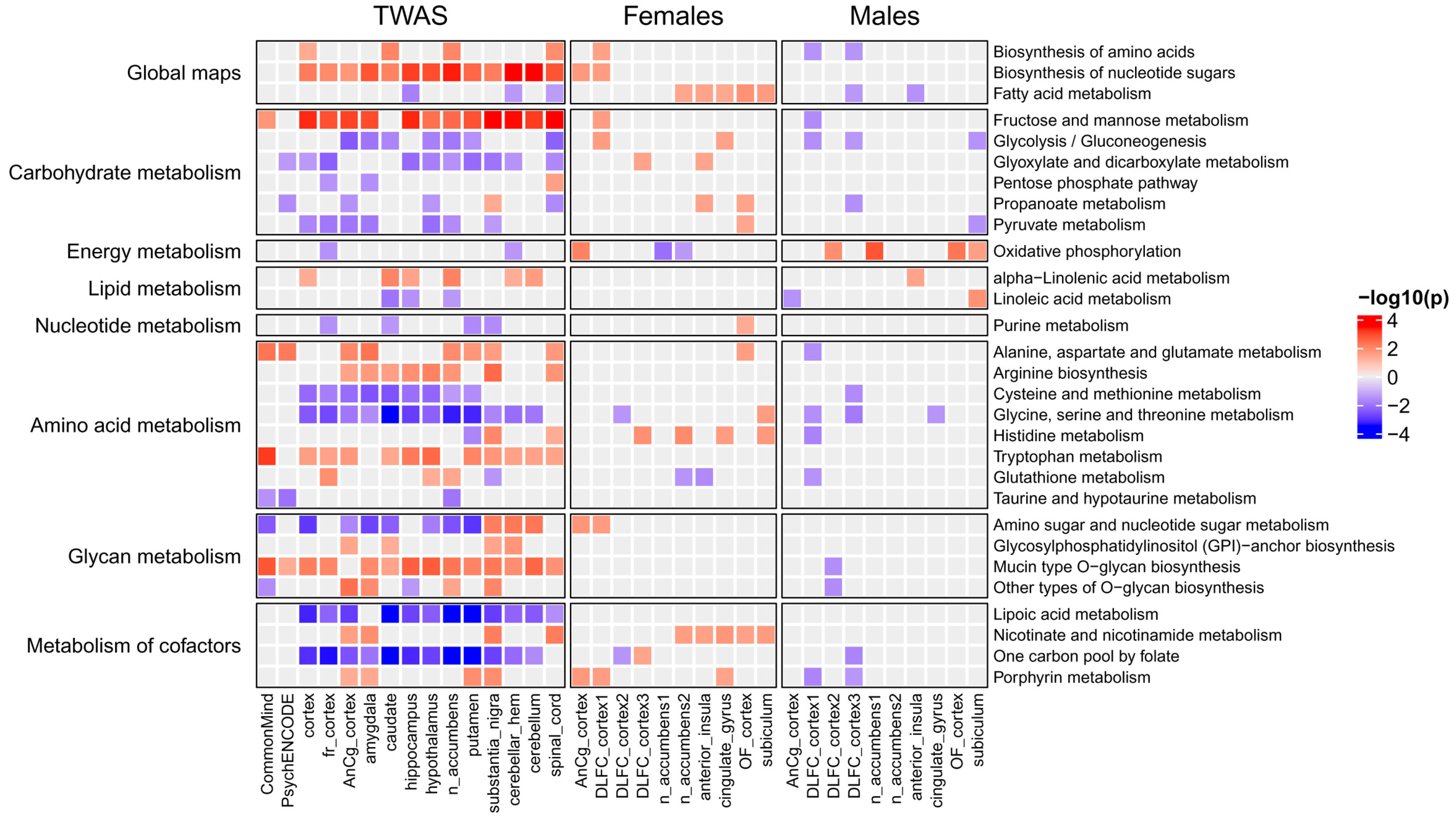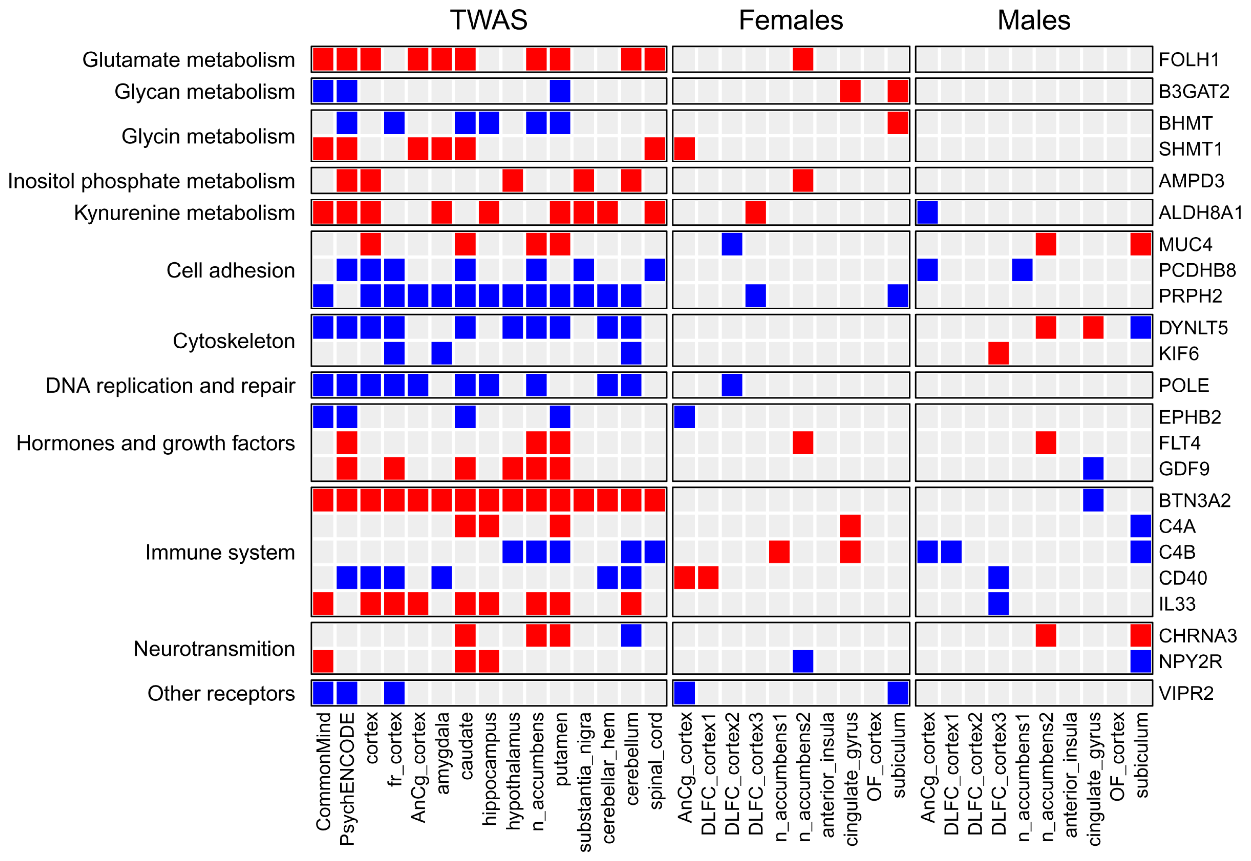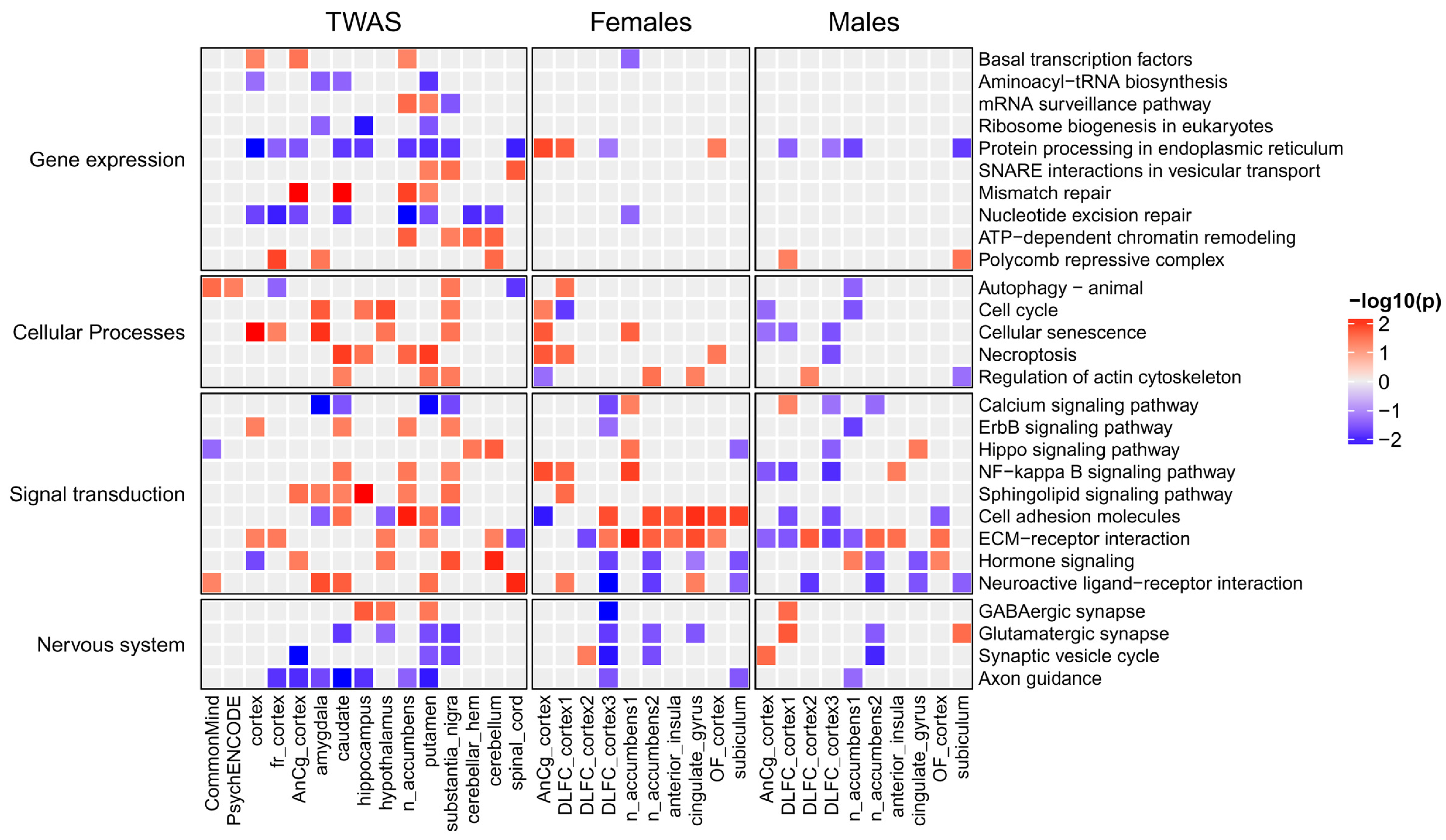 3.4. Comparison of Genes and Pathways Obtained by TWAS with Genes and Pathways Identified by Differential Expression Analysis in Post-Mortem Brain Regions