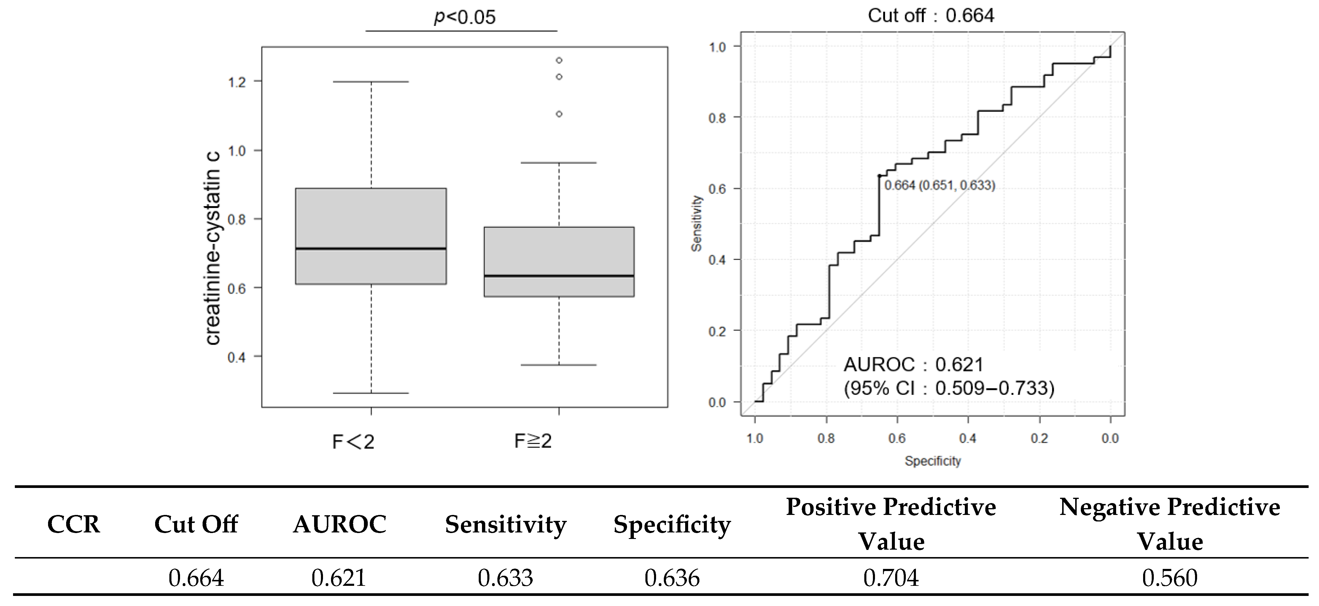 Cr/CysC (CCR) | 0.658 (0.581–0.816) | 0.634 (0.574–0.770) | 0.736 (0.610–0.900) | <0.05 |