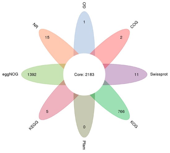 After sequence assembly, 32,824 unigenes were generated, with an assembly yielding a unigene N50 value of 2151 bp (Table S1). As shown in Table S2, 21,385 unigenes were annotated using multiple databases, including the NR (20,719 unigenes), Swiss–Prot (9687), COG (3612), KOG (12,301), eggNOG (18,121), Pfam (14,272), Gene Ontology (GO) (18,093), and Kyoto Encyclopedia of Genes and Genomes (KEGG) (16,889) databases. The distribution of unigene annotations across different pathways is shown in a petal diagram of the unigene annotation (Figure 1).