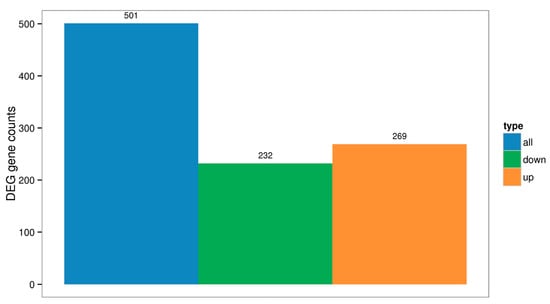 A total of 501 differentially expressed genes (DEGs) were identified in the liver between the control group and the group receiving 2% DBPH, of which 269 were upregulated, and 232 were downregulated. The number of differentially expressed genes in each category is illustrated in a histogram in Figure 2. A high number of unigenes with differential expression between these groups was observed, as shown in the volcano plot in Figure 3a.