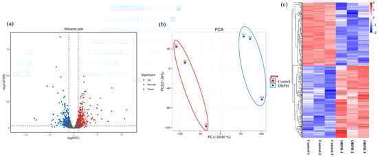 Principal component analysis (PCA) (Figure 3b) revealed scatter points corresponding to three replicates in both the negative control and 2% DBPH groups that were clustered tightly within their respective groups. This indicated consistent expression profiles within groups and clear separation between them. Hierarchical clustering of DEGs was performed to examine expression patterns across samples, and the resulting heatmap (Figure 3c) confirmed the distinct sample clustering according to treatment groups with replicates grouping closely within each group.