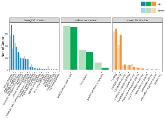 We used the GO database to categorize the DEG functions into three main clusters: biological processes, cellular components, and molecular functions. All DEGs in the liver were distributed across 35 GO categories (Figure 4). These DEGs were annotated for 21 biological processes, and the most significant enrichments were observed in cellular processes, metabolic processes, biological regulation, and responses to stimuli. In total, 3 GO categories were found in cellular components: cell anatomical entities, intracellular entities, and protein-containing complexes. Regarding molecular functions, 11 GO categories were identified, of which binding and catalytic activity were the most enriched.