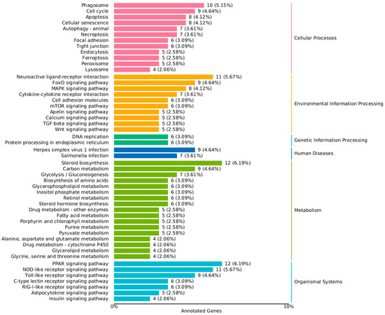 In the liver, KEGG pathway analysis categorized the data into six major categories: cellular processes (12 pathways), environmental information processing (10 pathways), genetic information processing (2 pathways), human diseases (2 pathways), metabolism (17 pathways), and organismal systems (7 pathways). Among these, the metabolic pathways had the highest number of DEGs, and the top three significantly enriched pathways in this category were steroid biosynthesis, carbon metabolism, and glycolysis/gluconeogenesis (Figure 5).