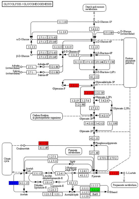 KEGG annotation analysis of the glycolysis/gluconeogenesis pathway. Note: Relative to the control group, the nodes colored in red represent the enzymes related to up-regulated genes and the green ones represent that down-regulated gene. Blue ones represent enzymes related to both up- and down-regulated genes. The number in the box stands for the EC number.