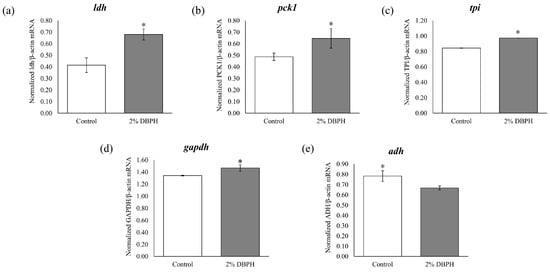 Quantitative real-time PCR analysis of idh (a); pck1 (b); tpi (c); gapdh (d); and adh (e) expression in the liver of flowerhorn fish after the 90-day feeding trial. Bars marked with asterisks denote statistically significant differences between the control and 2% DBPH groups (p < 0.05).