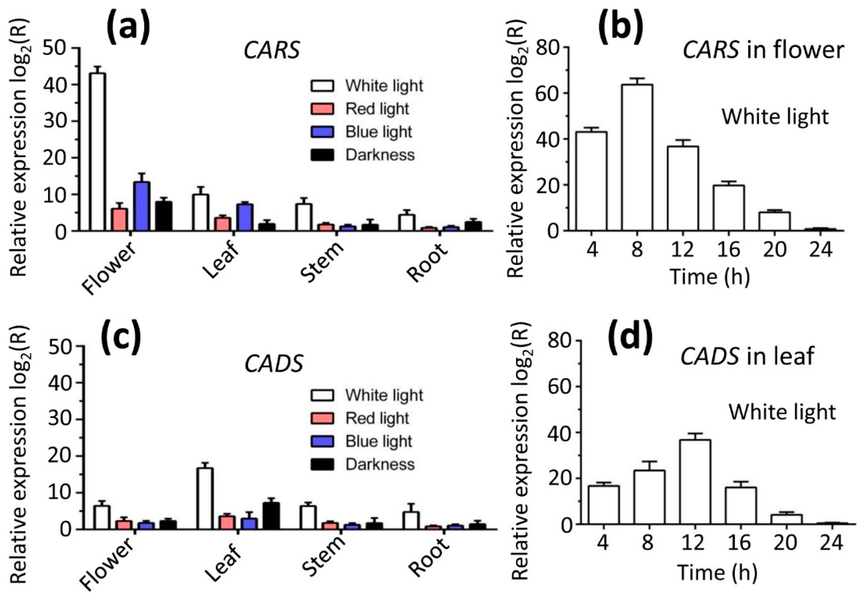 2.8. Expression Profiles of Genes CARS and CADS in Different Tissues Under Natural Light