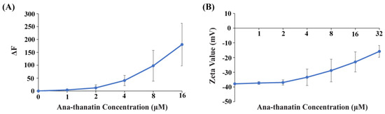 (A) Changes in fluorescence emission (ΔF) of NPN as a function of concentrations of Ana-thanatin in E. coli cell solutions. Experiments carried out in 10 mM sodium phosphate buffer with bacterial cell density OD600 of 0.5. Fluorescence spectra were recorded with an excitation wavelength of 350 nm and an emission of 390–450 nm. (B) Peptide dose-dependent changes in ζ potential values of E. coli cells.