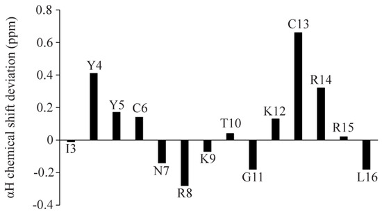NMR spectroscopy serves as the most common method of determining the atomic resolution structures of AMPs in solution and in solid states [46,47,48,49,50]. Analyses of two-dimensional 1H-1H TOCSY and 1H-1H NOESY spectra were utilized to obtain the sequence-specific resonance assignments of individual amino acids of Ana-thanatin in free solution. Figure 2 shows the secondary chemical shift [51] or chemical shift deviation from a random coil of αH resonances of amino acid residues of the Ana-thanatin peptide. As seen, residues Y4, Y5, C6, K12, C13, and R14 delineate positive deviation values, suggesting β-strand conformations for these residues, whereas negative secondary shift values were estimated for residues N7, R8, K9, and G11 (Figure 2). Two-dimensional 1H-1H NOESY and tr-NOESY spectra of Ana-thanatin in free solution and in complex with LPS micelle showed marked differences in terms of the number of NOEs detected (Figure 3). Ana-thanatin demonstrated a far greater number of NOEs in complex with LPS micelles. Table 2 summarizes the long-range NOE contacts that could be detected for both Ana-thanatin in free solution and in complex with the LPS outer membrane. There were only six long-range NOEs for the peptide in solution, whereas in complex with LPS micelles, as many as 19 long-range NOEs were observed. Observation of more long-range NOEs in complex with LPS micelle indicates that the peptide’s structure could be better folded in comparison to its free state.