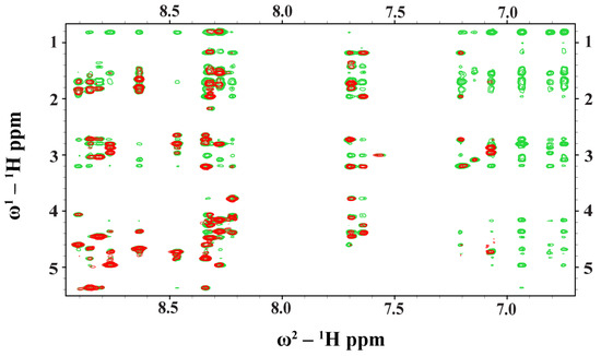 Overlay of partial 1H-1H two-dimensional NOESY (red contour) and tr-NOESY (green contour) spectra of Ana-thanatin peptide. NOESY/tr-NOESY spectra showing NOEs involving downfield-shifted amides and aromatic proton resonances along the w2 dimension, with the upfield-shifted aliphatic proton resonances along the w1 dimension. Clearly, more NOEs were detected in the presence of the LPS micelle.