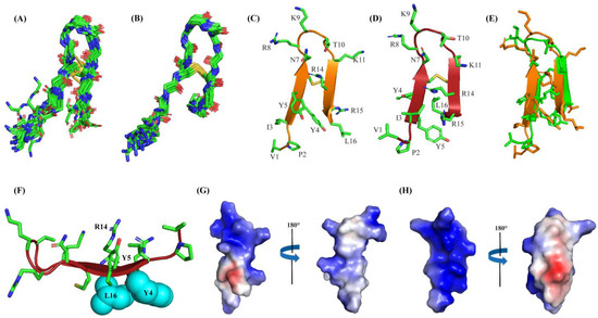 (A) Superposition backbone atoms (αC, N, C’) of twenty low-energy structures of Ana-thanatin in free solution. (B) Superposition backbone atoms (αC, N, C’) of twenty low-energy structures of Ana-thanatin in complex with LPS micelle. (C, D) Ribbon representation of structure of Ana-thanatin in free solution (C) and in complex with the LPS micelle (D), showing sidechain orientation and backbone topology. (E) Superposition of structures of Ana-thanatin in free solution (green ribbon) and in complex of the LPS micelle (orange ribbon). (F) Cation-π interactions between sidechains of residue Y5 and R14 and non-polar packings between sidechains of residues Y6 and L16 in the β-hairpin structure of Ana-thanatin determined in complex with LPS micelle. (G,H) Electrostatic potential surface (blue: positive charge; red: negative charge; white: neutral) of Ana-thanatin structure in free solution (G) and in complex with LPS micelle (H). Structural coordinates of Ana-thanatin in free solution and in complex with LPS micelles are provided in Supplementary Materials S1 and S2, respectively.