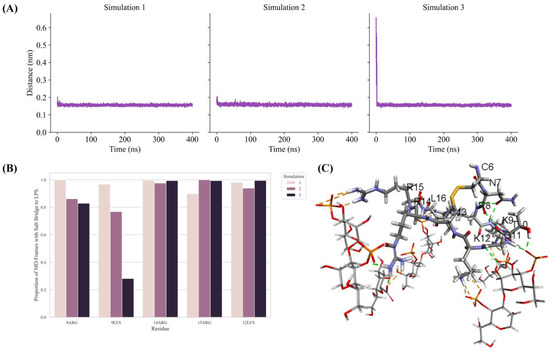 To gain better insights into peptide–LPS interactions, 400 ns MD simulations were performed using the LPS outer membrane structure of Ana-thanatin and a lipid bilayer consisting of the LPS and DPPE lipids. Note that DPPE has been used in constructing the LPS–lipid bilayer in a previous work involving pod-thanatin [40]. The minimum distance between the Ana-thanatin structure and the LPS in the bilayer was observed to be reduced rapidly and remained stable during the course of the three MD simulations (Figure 5A). Analyses of three MD trajectories revealed that most of the cationic residues of the β-hairpin structure of Ana-thanatin could be involved in potential salt bridge or ionic interactions with the negatively charged phosphate groups of the LPS molecules (Figure 5B). Figure 5C delineates a representative structure of the LPS–Ana-thanatin complex, demonstrating ionic and hydrogen bonding interactions in the MD simulation.